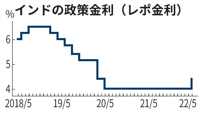 【ムンバイ=花田亮輔】インド準備銀行(中央銀行)は4日、政策金利(レポ金利)を0.4%引き上げて4.4%にすると発表した。利上げは2018年8月以来3年9カ月ぶり。インド中銀は4月まで11会合連続で政策金利を据え置いてきたが、足元では目標を上回る物価上昇が続いていた。