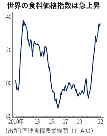指数は肉類や穀物など主要5品目の国際取引価格から算出し、投資家や企業が注目している。21年12月は5カ月ぶりに下落したが、再び上げに転じた。世界でインフレが加速しており、特に食料価格の高騰は途上国の貧困の拡大をまねく懸念が強い。