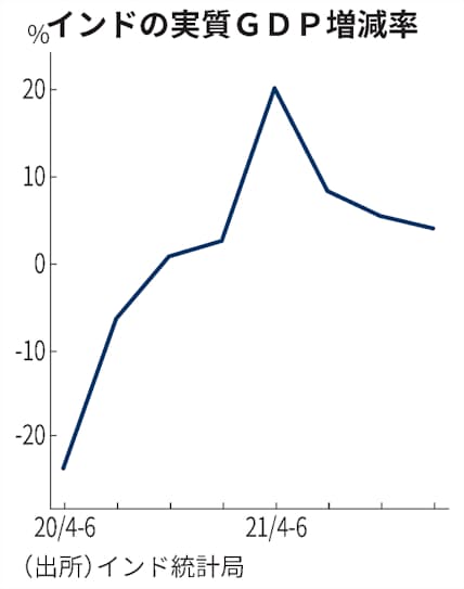 インドではオミクロン型が1月上旬から広がり、新規感染者は同月下旬に1日あたり34万人まで増えた。首都ニューデリーや商都ムンバイなどの各地で夜間外出禁止の措置を導入し、工場の操業に影響を及ぼした。オミクロン型の感染拡大は2月に落ち着いたものの、同月下旬にロシアがウクライナに侵攻した余波で商品相場が上昇。インドでも石油や野菜が値上がりし、1~3月期の個人消費は1.7%増の微増にとどまった。