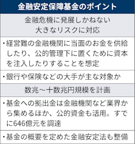 地銀の経営破綻などリスクが及ぶ範囲が限定的な場合は既存の基金などで対応する。新基金は、既存の仕組みだけで十分な流動性の供給や損失の穴埋めができない場合のバッファーとなる。