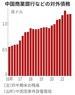 中国国内の商業銀行などの対外債務は21年末時点で1兆1900億ドル(約158兆円)と、2年で3割増えた。中国の金融機関の経営リスクが海外にもたらす影響は拡大している。