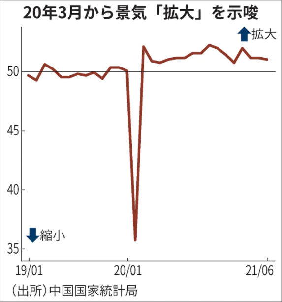 中国の国家統計局が30日に発表をした21年6月の製造業購買担当者景気指数(PMI)が50.9と先月よりも0.1下がっています。これは3か月連続の悪化になります。好不況の目安になる50.0にもどんどん近づいてきています。現在は何とかその境目は上回るも、半導体や電力の供給不足が生産回復の重荷になります。