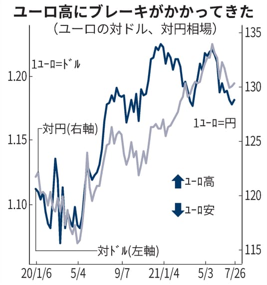 昨年来のユーロ高の基調にブレーキがかかってきました。欧州中央銀行(ECB)が物価目標のハードルを上げて、超低金利政策の長期化を示唆したことで、ユーロから投資資金が流れだしています。新型コロナウイルスの感染拡大が収まった後の欧州の景気回復に向けて、輸出に悪影響を及ぼすユーロ高は阻害要因になってきます。市場では日本も巻き込んだコロナ後の通貨安競争再燃を予想する声を漏れ始めています。