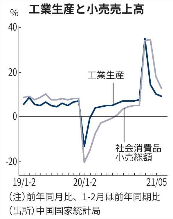 中国国家統計局が21年6月16日に発表をした21年5月の主な経済統計によると、工業生産は前年の同期比で8.8%増えていました。伸び率は4月の9.8%から鈍化しました。自動車の生産量が半導体の不足の影響や昨年の販売促進の反動で4.0%減少。20年3月以来のマイナスとなりました。工業生産は新型コロナウイルスの感染が広がる前の19年5月と比較すると13.6%も上回っています。