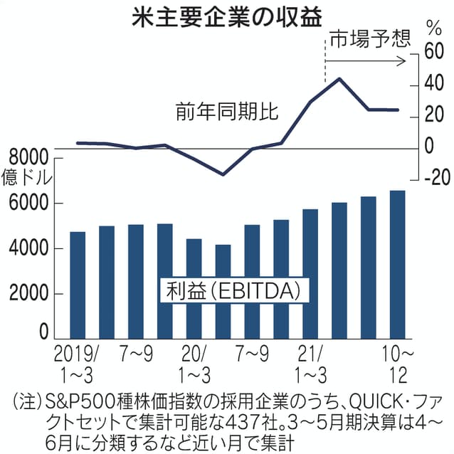 アナリストの分析予想でも7月から9月期以降も最高益の更新は続くだろうと見られています。ただ増益のペースは落ちるだろうという予測もあります。経済対策の効果は徐々に薄れていくほかに、人件費や材料と言ったコスト面での不透明感は根強くなっています。新型コロナウイルスデルタ株の脅威もアメリカでも出てきていて、経済再開の流れが足踏みするリスクも懸念材料になりそうです。