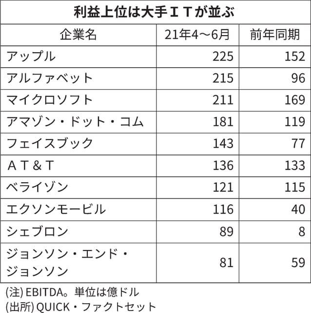 QUICK・ファクトセットのデータベースを基に、本業での稼ぐ力を示すEBITDA(利払い・税引き・償却前の利益)を集計しました。対象はSP500種の株価指数の組み入れ企業のうちで、比較的可能な437社で大手銀行は含まれません。